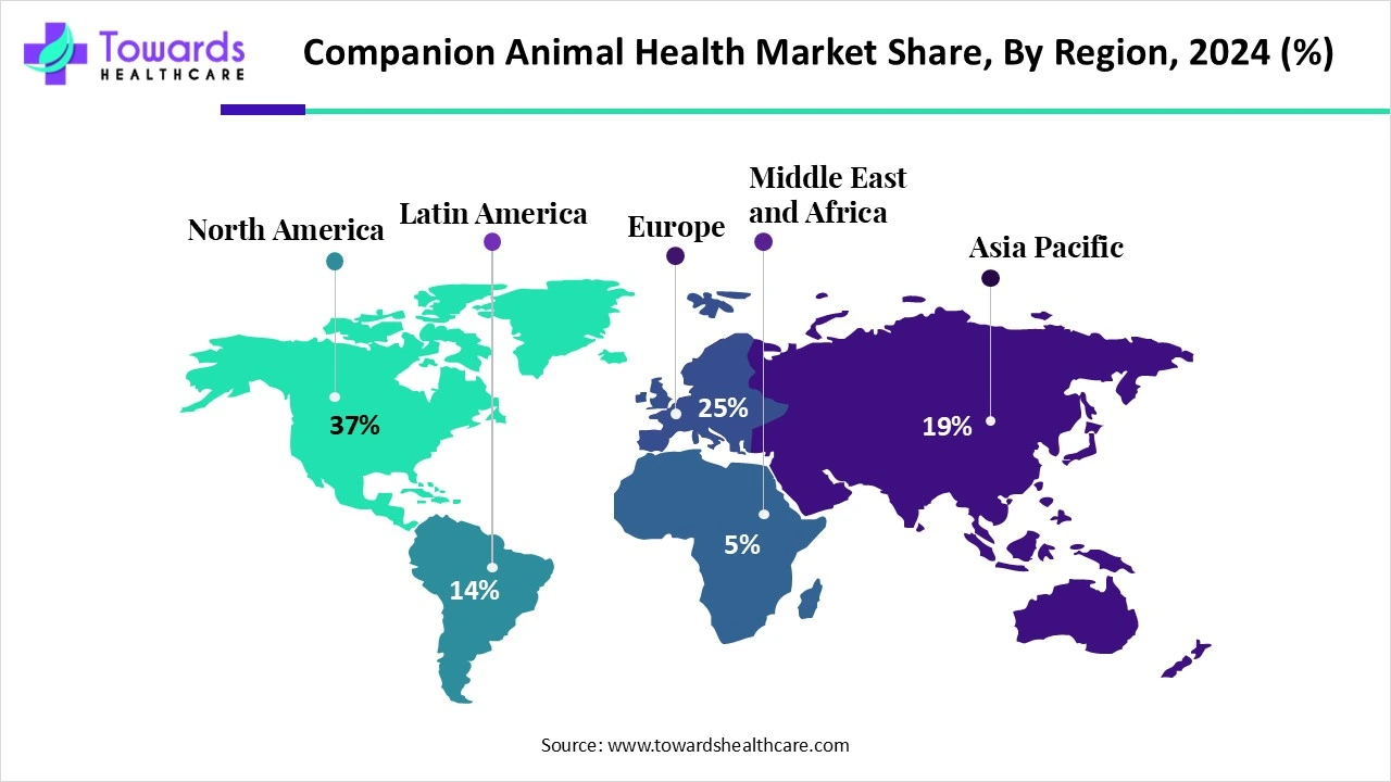 The companion animal health market is the largest in North America by 37% and is regarded as the largest market globally, primarily due to high rates of pet ownership, developed veterinary practices, and more comprehensive insurance for pets than in any other global region. Specifically, the U.S. market has long been characterized by pet humanisation, with pets being considered family members and with considerable annual spend on pet health and wellness. Established manufacturers of pharmaceuticals and diagnostics are present in the region and the engagement of these organisations in new product launches and service enhancements sustains growth. Additionally, regulatory and reimbursement environments are established, allowing for faster uptake of novel therapies.